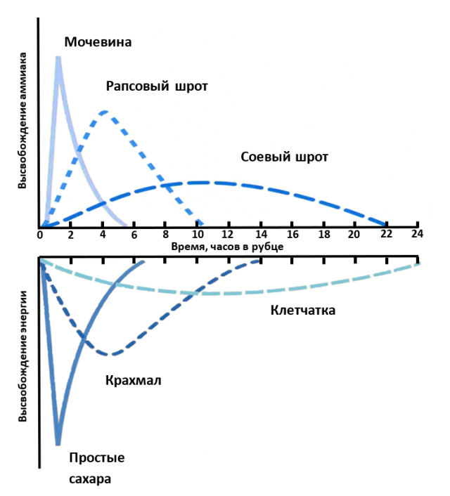 Помимо наличия источников азота для синтеза микробного белка необходимо наличие энергии. Причём скорость высвобождения из кормов аммиака и энергии должна быть синхронизирована (рис.2).