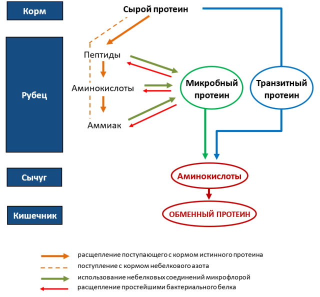 Итак, с кормом животное получает сырой протеин, который представляет из себя не только белок (или истинный протеин), но и небелковый азот, который представлен как более простыми органическими соединениями, например пептидами, свободными аминокислотами, амидами, аминами, так и неорганическими, например, солями аммония. Часть истинного протеина доступна для рубцовой микрофлоры. Под действием протеолитических ферментов микроорганизмов белки корма расщепляются до пептидов, аминокислот, а затем до аммиака (рис. 1). Все эти соединения, наряду с поступившим с кормом небелковым азотом, бактериальная микрофлора рубца использует для построения собственных клеток и роста. До 50% бактерий при этом служит питанием для простейших. Переваривая бактериальные клетки, они возвращают часть азота во внутреннюю среду рубца в виде всё тех же небелковых соединений, которые затем становятся снова доступны для бактерий (Puniya et al., 2015). Этот процесс называют круговоротом или рециркуляцией азота в рубце.
