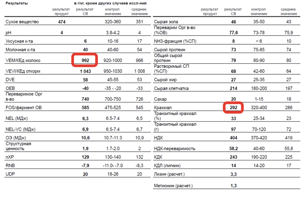 - Показатель крахмала: 310 и 213 г/кг СВ соответственно.