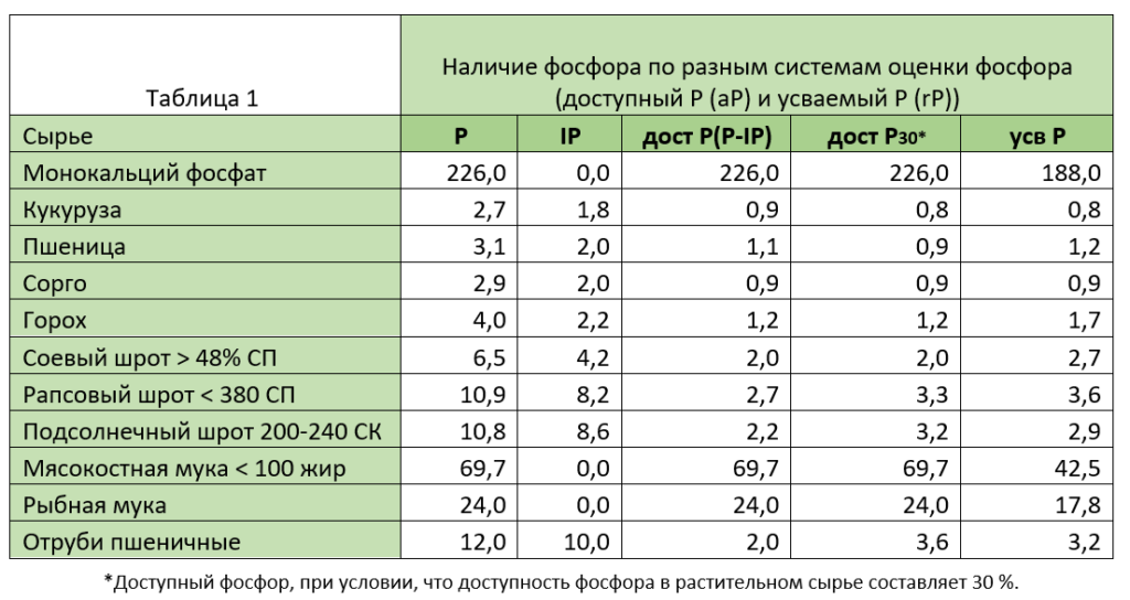 В сырье фосфор может характеризоваться как фитатный Р (фитатно-связанный фосфор, так же известный как инозитол (IP)) и нефитатный фосфор. В большинстве систем доступного Р, нефитатный фосфор считается доступным на 100% . Таким образом, доступность Р из неорганических источников, таких как монокальций фосфат, и из источников животного происхождения, как правило, устанавливается на 100%. Для связанного фосфора (IP), существуют различия между имеющимися системами. В большей части американской литературы, считается, что IP будет недоступен для птицы. В данном случае доступный фосфор рассчитывается так: Р общ.- IP. В других системах доступного фосфора, такие как старые системы INRA и CVB (1997) наличие доступного Р в растительном сырье считалось 30%. В существующей системе INRA (2004), доступность Р в сырье основана на относительной доступности Р по сравнению с эталоном, что приводит к высокой или низкой доступности общего фосфора, тогда как ранее предполагалось 30%. Таким образом, система оценки Р основана на разнице между общим Р и IP, которая может привести к другим значениям доступного Р для сырья и кормов кроме системы доступного Р, которые вычисляют с определенной доступностью IP. Это означает, что следует соблюдать осторожность при переводе имеющихся рекомендаций доступного Р из одной системы в другую. В целом, рекомендации для Р-IP ниже, чем рекомендации, которые имеют определенную доступность IP с начала расчета.
