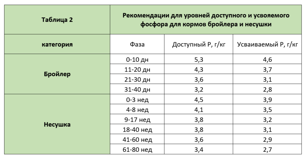 В Таблице 2, в качестве примера приведены рекомендуемые уровни доступного и переваримого фосфора для бройлеров и несушек. В качестве общего правила, уровень переваримого фосфора у растущих птиц составляет около 86% доступных уровней фосфора.