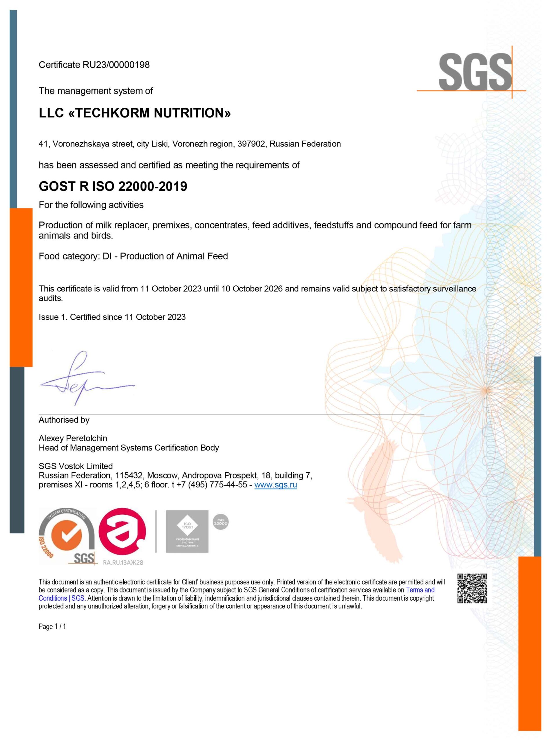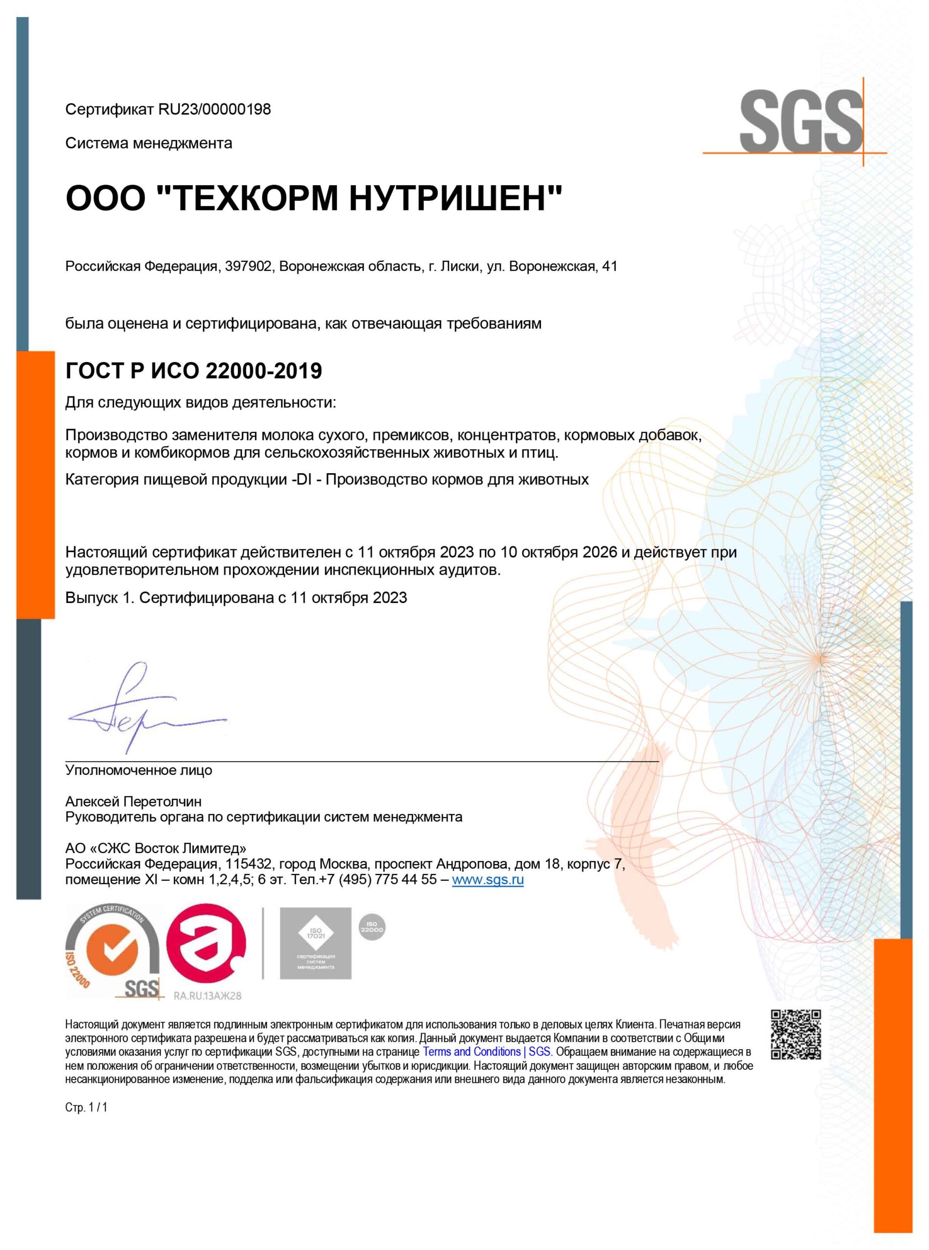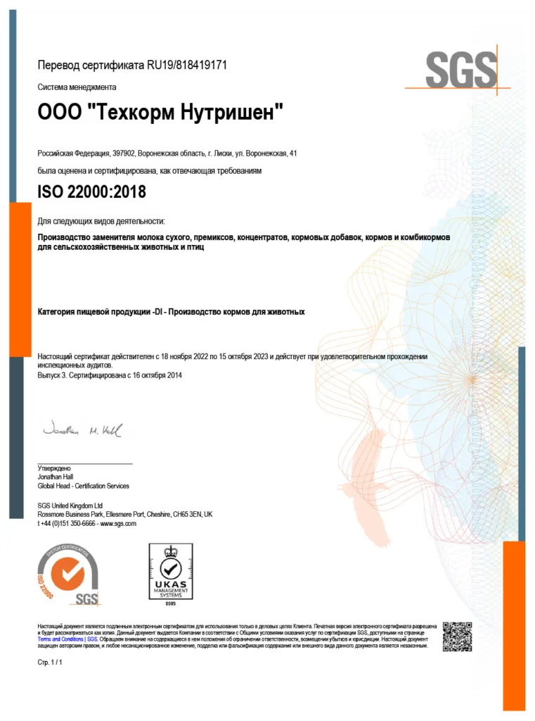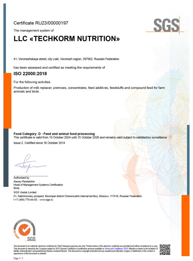 Система менеджмента ООО «Техкорм Нутришен» сертифицирована, как отвечающая требованиям международного стандарта ISO 22000:2018 «Система менеджмента пищевой безопасности. Требования к любой организации, участвующей в цепи создания пищевой продукции».
