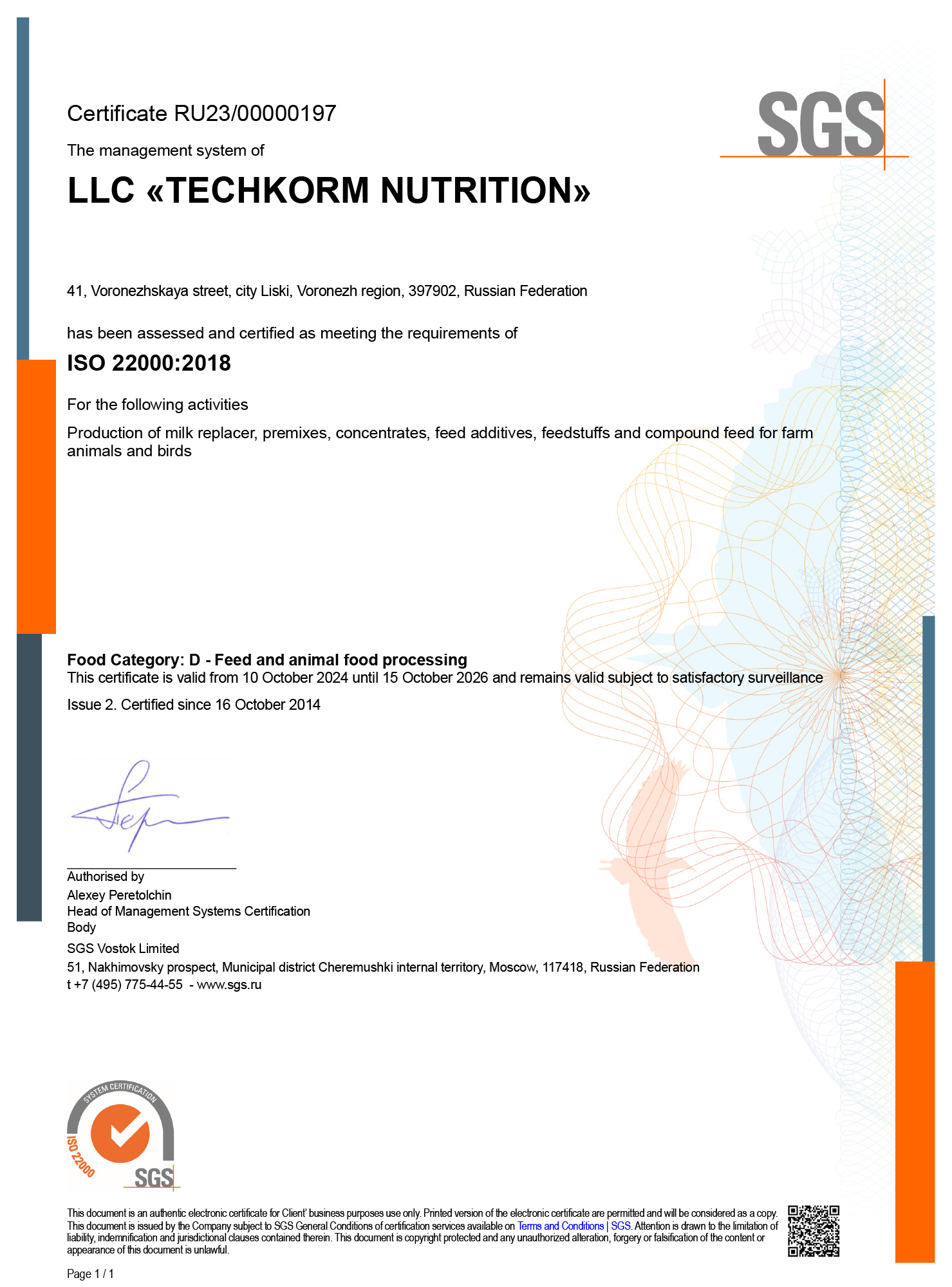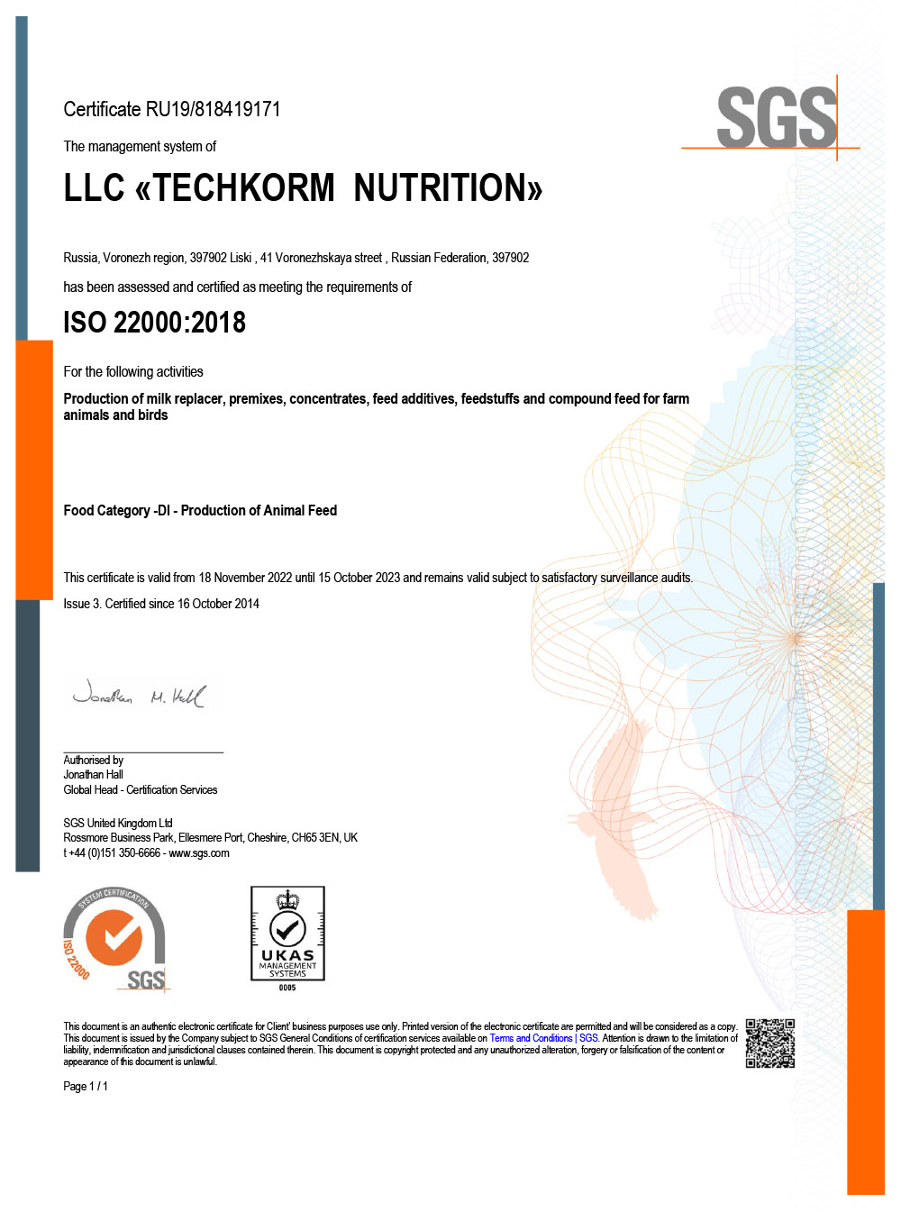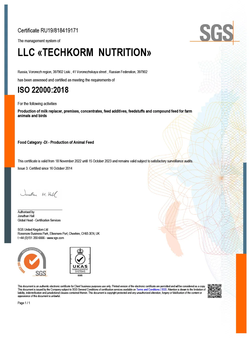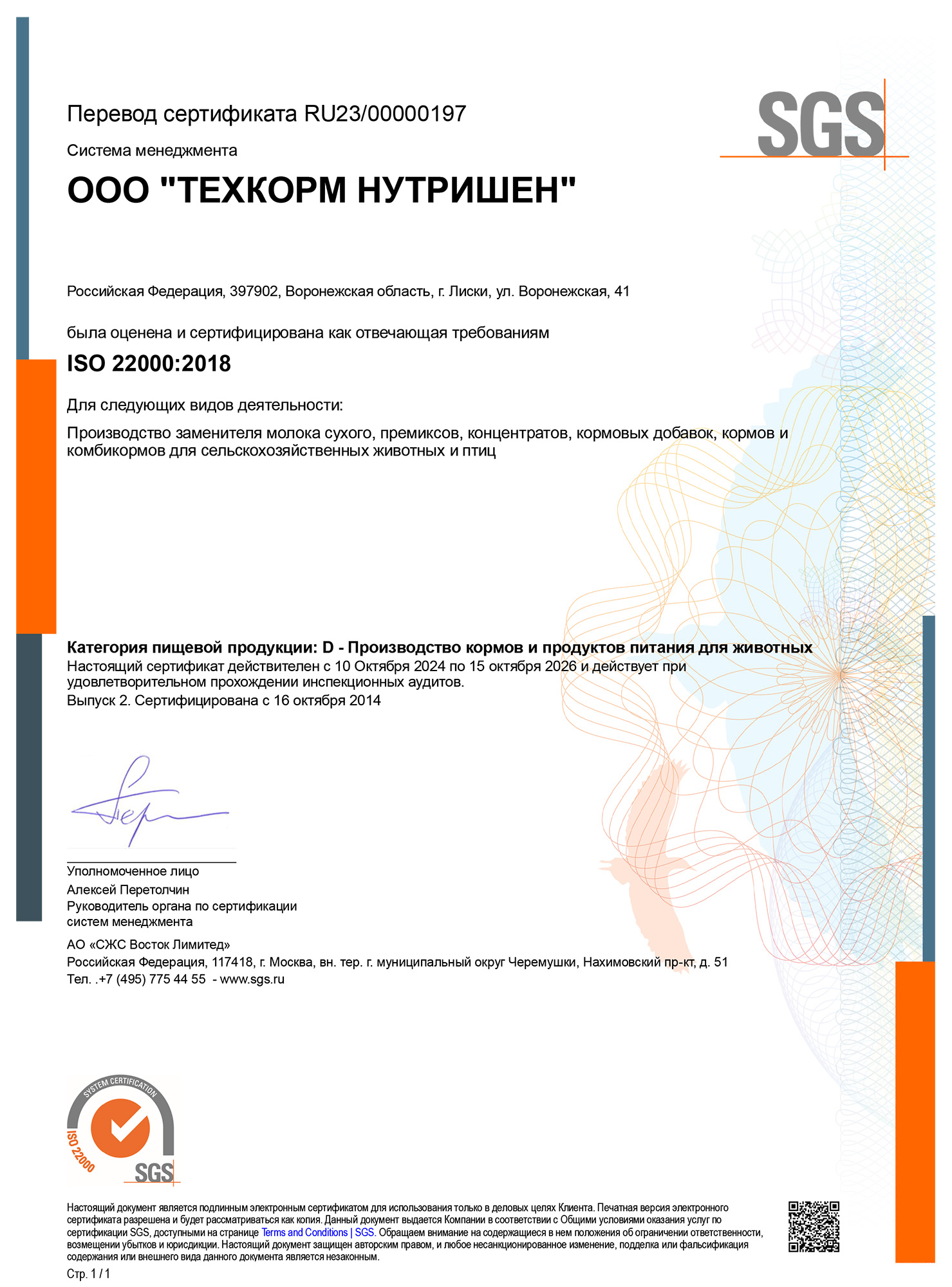 Система менеджмента ООО «Техкорм Нутришен» сертифицирована, как отвечающая требованиям международного стандарта ISO 22000:2018 «Система менеджмента пищевой безопасности. Требования к любой организации, участвующей в цепи создания пищевой продукции».