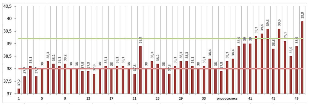 - Верхняя граница температуры (зеленая линия) – 39,2.