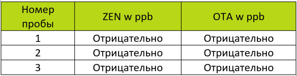 В исследуемых пробах получен отрицательный результат на Зеараленон и Охратоксин.