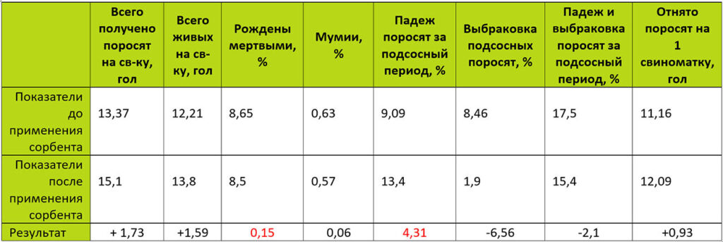 На группе свиноматок после применения адсорбента микотоксинов получены следующие результаты:
