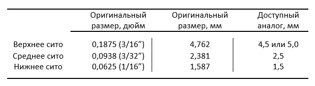 - 3 сита (Ø 150 мм, высота 90 мм) с отверстиями следующих размеров: