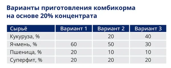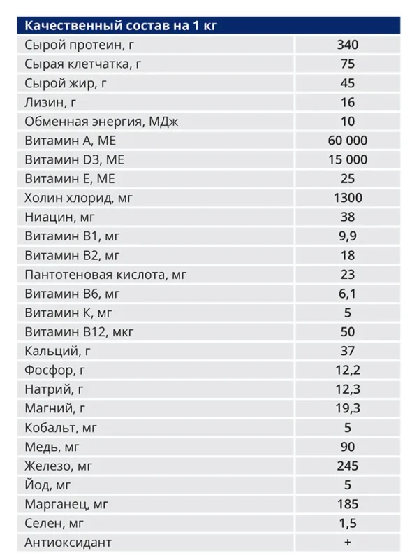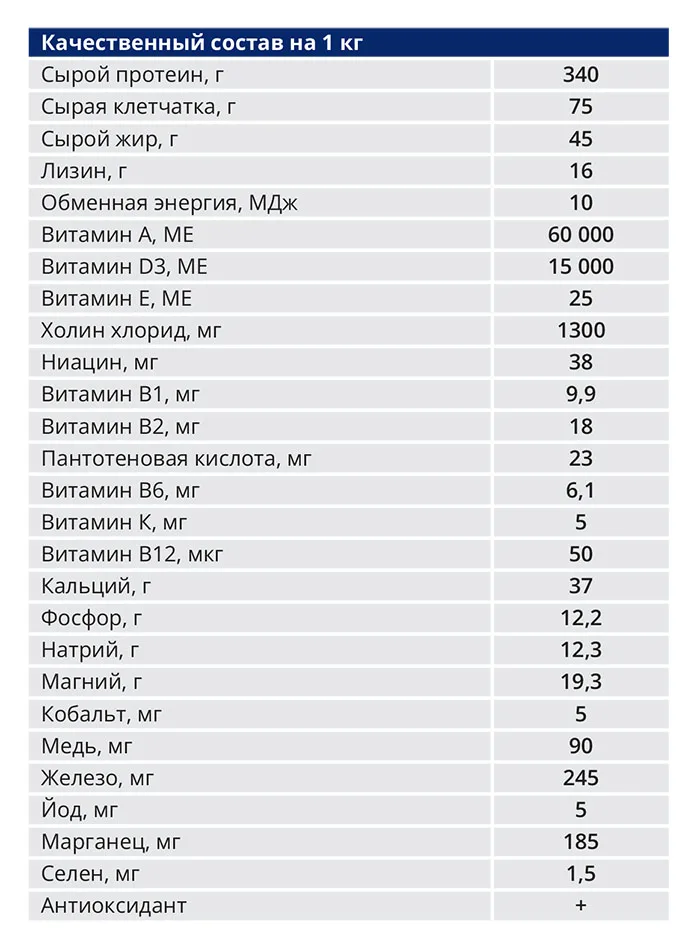 Шрот соевый, белковая кормосмесь, жмых подсолнечный, отруби пшеничные, витаминно-минеральный концентрат.