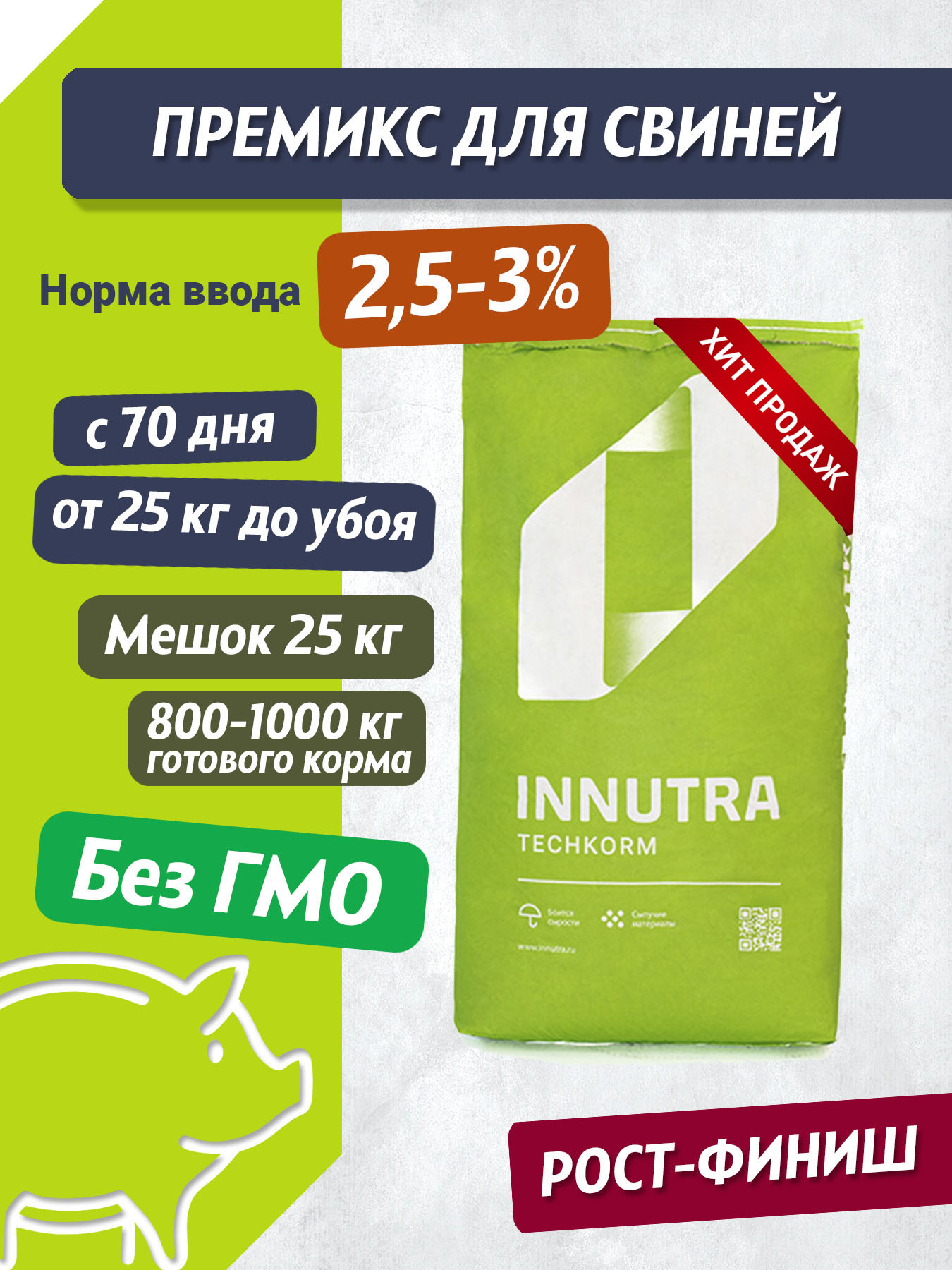 - Содержит полный набор аминокислот, минералов и витаминов для получения высоких привесов у откормочных свиней.