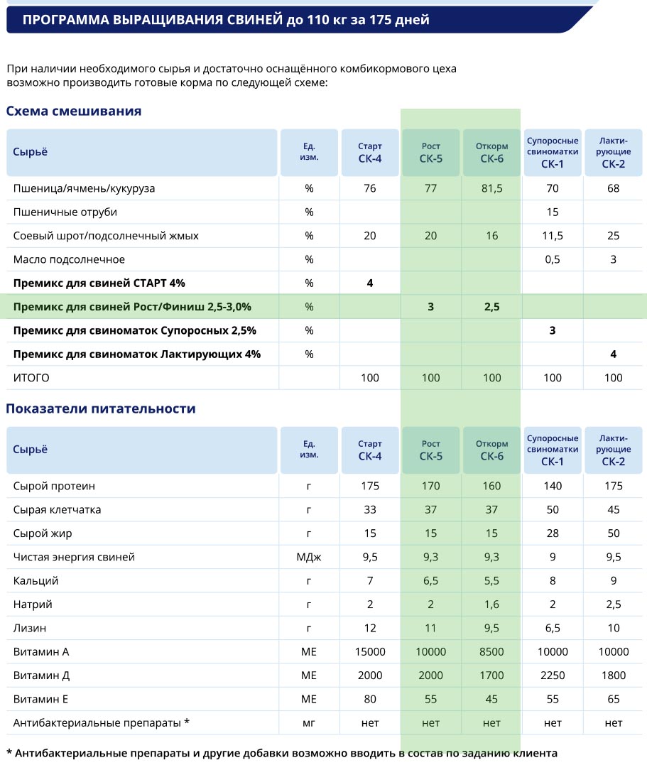 Этот премикс рекомендуется применять в составе программы выращивания свиней на убой в возрасте 170 дней с живой массой 115 кг.