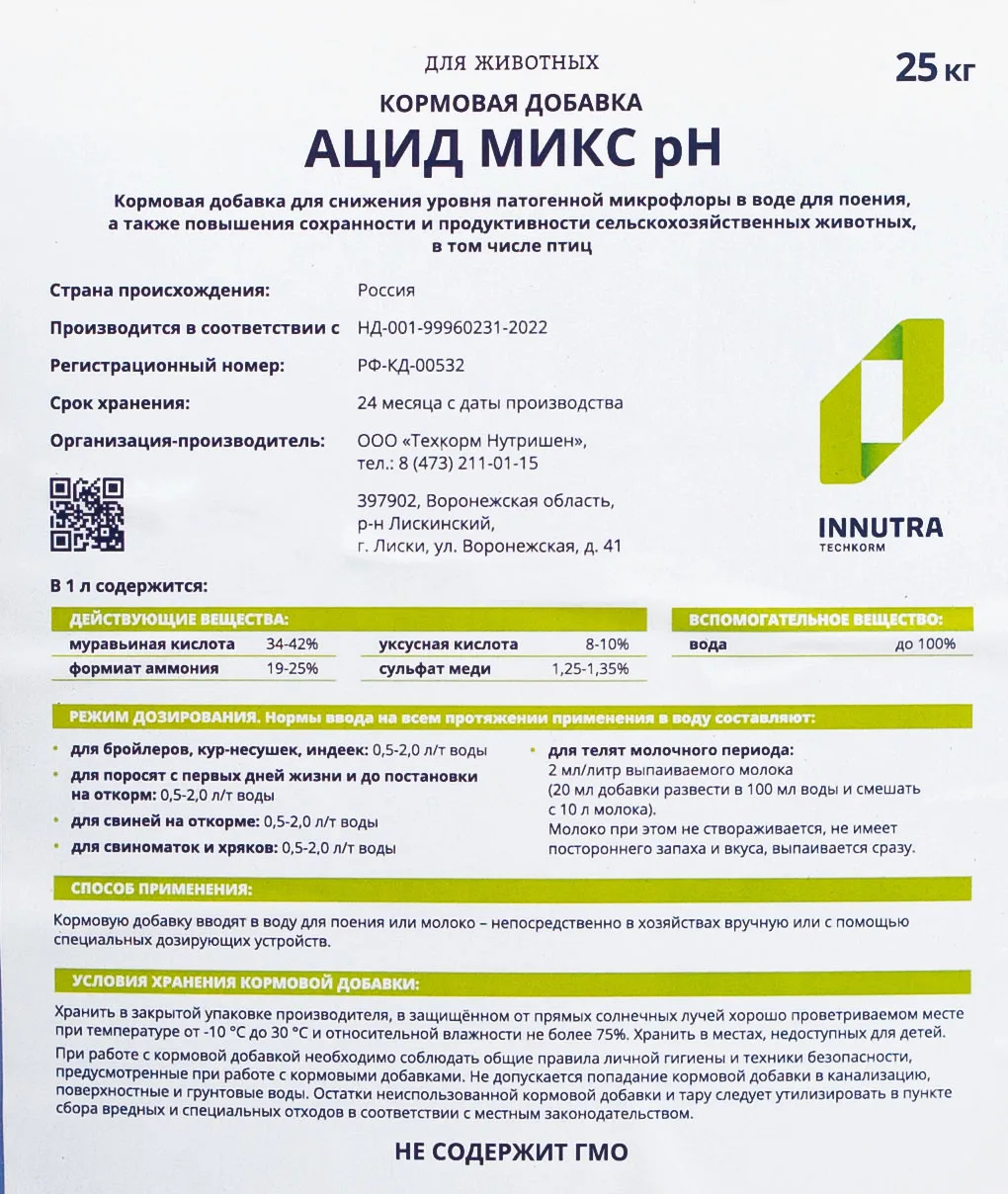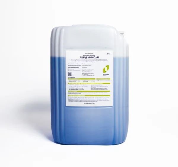 Буферизированные кислоты в составе Ацид Микс pH обеспечивают эффективное действие кормовой добавки в кишечнике. Ацид Микс рН улучшает пищеварение и переваривание корма, таким образом повышая конверсию корма. Сульфат меди в составе Ацид Микс рН эффективно борется с биоплёнкой в системах поения и очищает систему
