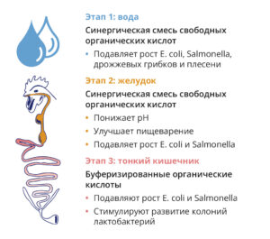 Цыплята особенно уязвимы в первые недели жизни, пока их кишечная микрофлора не сформировалась окончательно. Буферизированные органические кислоты в составе Ацид Микс pH снижают количество E coli и Salmonella в кишечнике, не воздействуя при этом на лактобактерии.