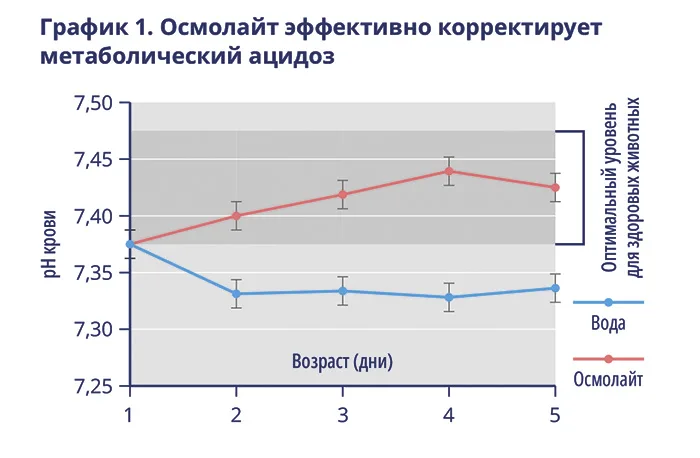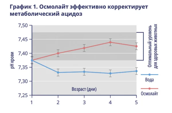 Осмолайт® способен поддерживать и восстанавливать рН крови телят в пределах нормы, в то время как чистая вода и гипертонические растворы не способны или менее способны на это.
