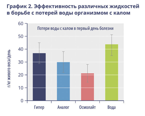 Исследования показали, что Осмолайт® способен уменьшить потерю воды с калом в первый день лечения по сравнению с контрольной группой, получавшей только воду. Группы животных, которым вместо этого предлагали гипертонические растворы, не имели существенного уменьшения потери воды с калом.