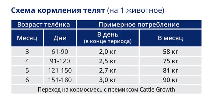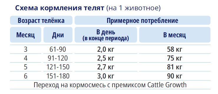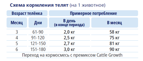 Используется в кормлении телят после отъёма как замена престартерному корму согласно схеме кормления (см рис. выше).