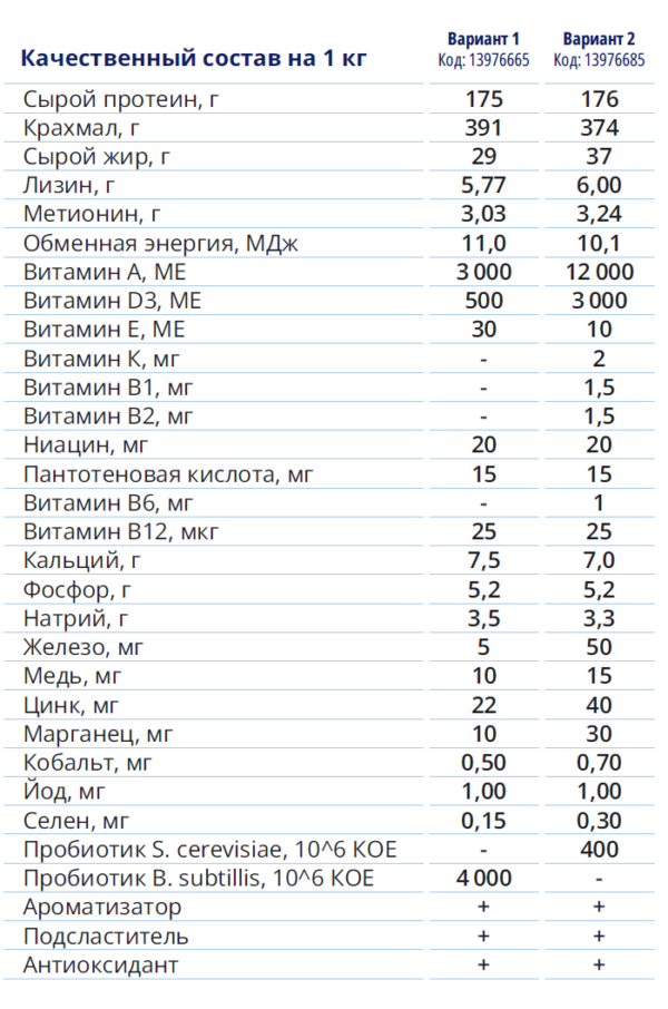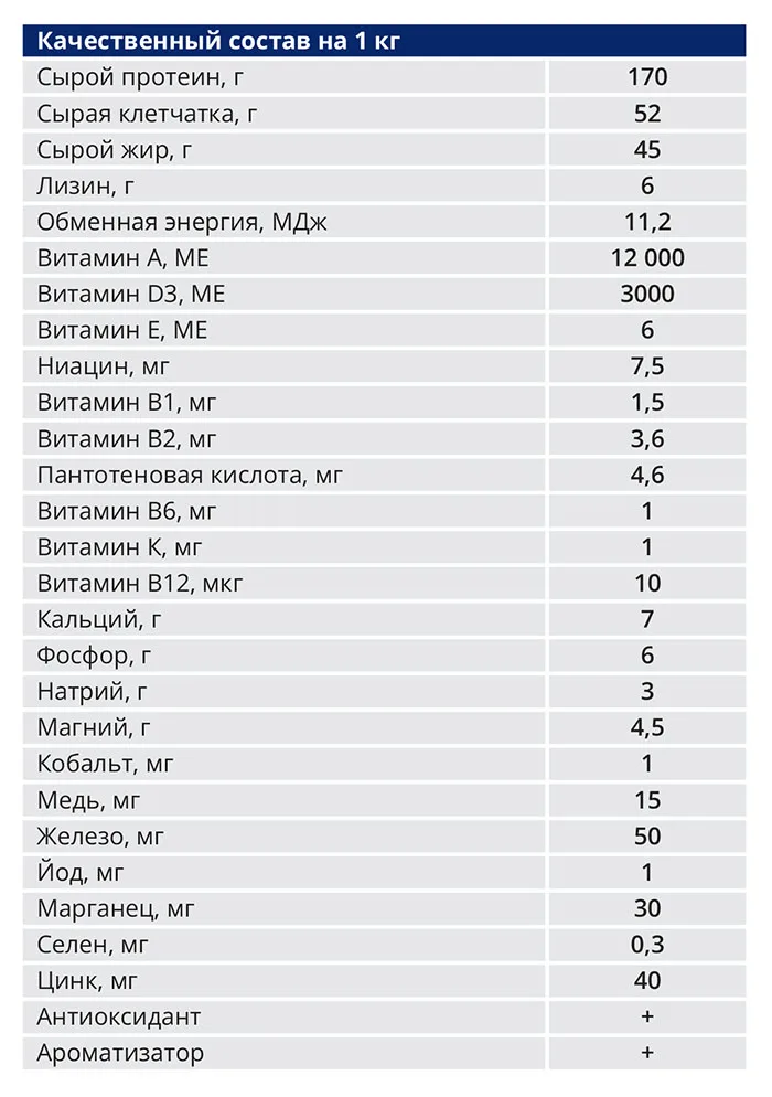 Кукуруза, шрот соевый, ячмень, жмых подсолнечный, пшеница, кукурузный глютен, отруби пшеничные, сахар, дрожжи кормовые, масло подсолнечное, витаминно-минеральный премикс, мел, соль